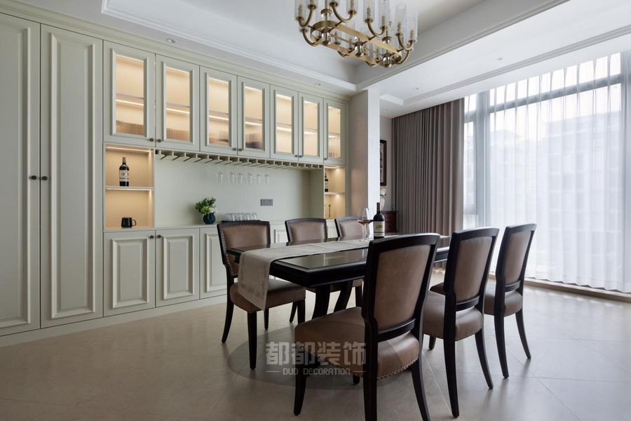 客餐厅一体式设计,以乳白色和深棕色为主要色,整面墙的柜子满足日常收纳需求,顶层收纳区采用磨砂玻璃做柜门,方便识别取物而又增添一分朦胧美,中间开放储物区,放置绿植和透明玻璃杯,在实用的同时也提升了餐厅颜值,金属拉手时尚美观又大气。