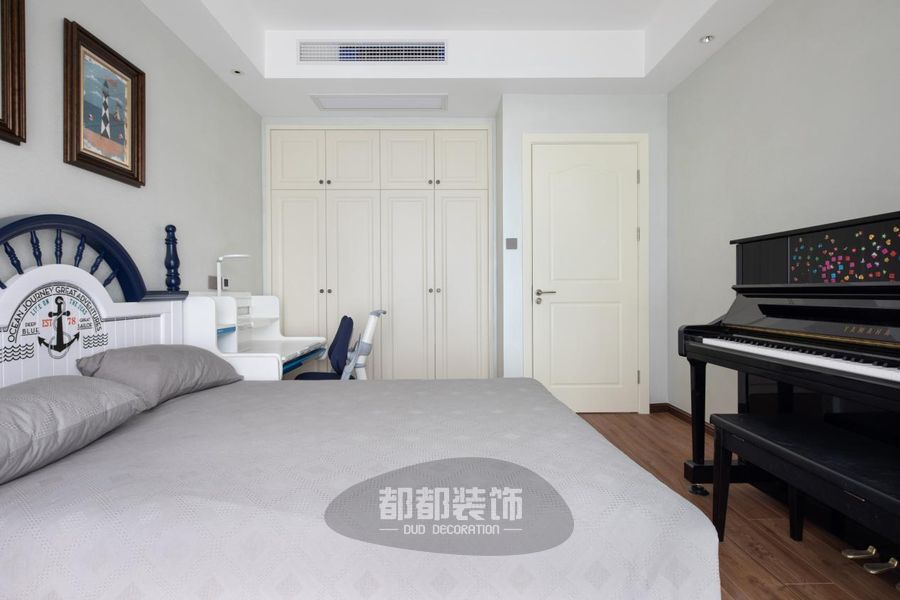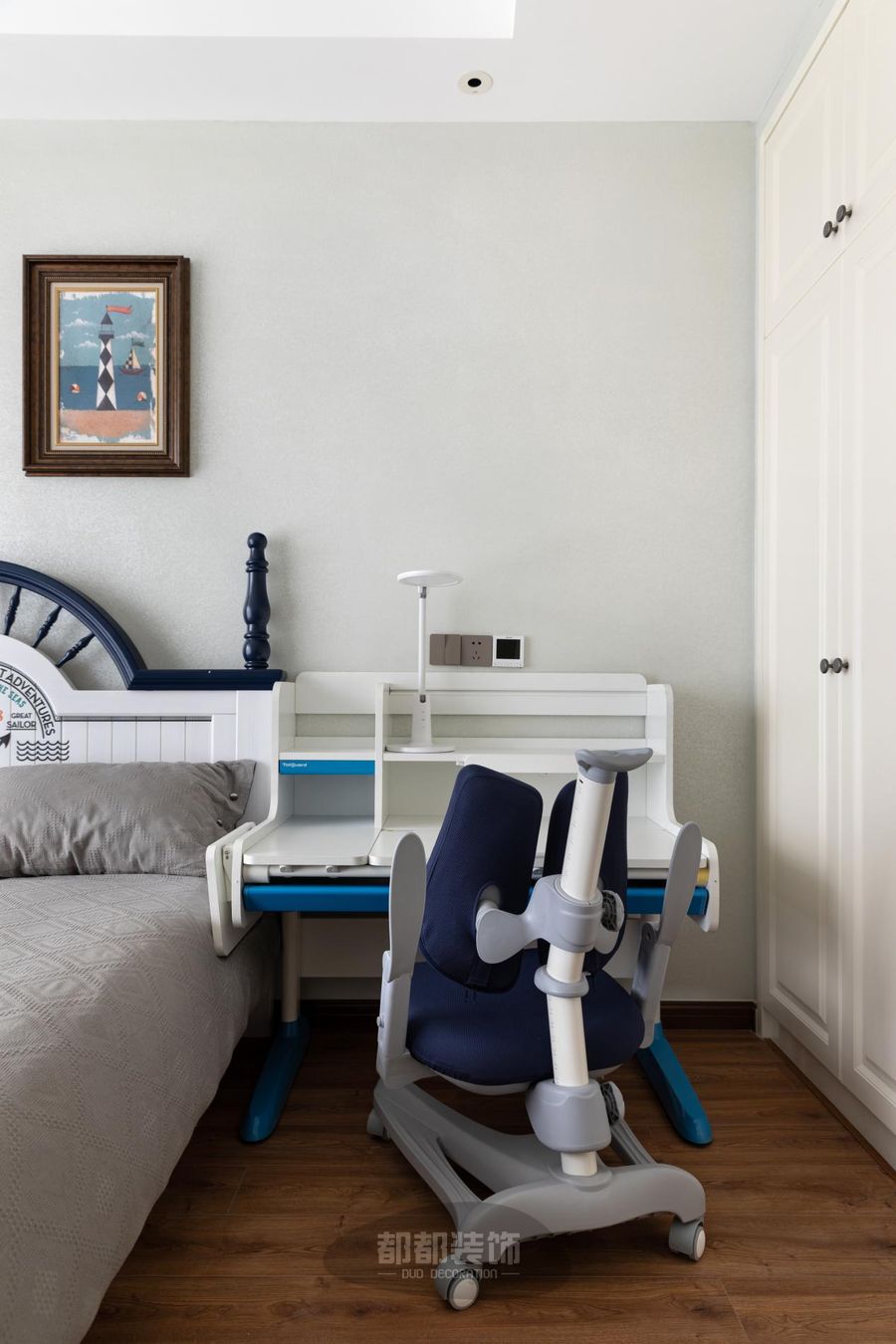 儿童房主打地中海设计,蓝白配色给房间带来一种清凉、自由的享受,海洋的魅力得到最大程度的释放。深蓝色海洋风船舵设计感十足的床头板,让睡觉都成为了一种乐趣,背景墙点缀风塔漫画装饰画,富有童真童趣之感。