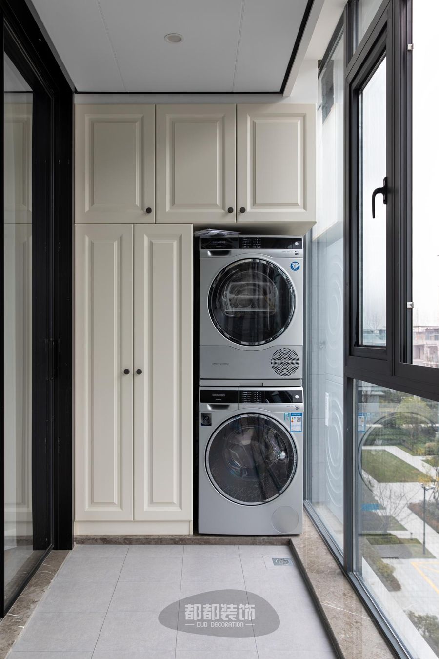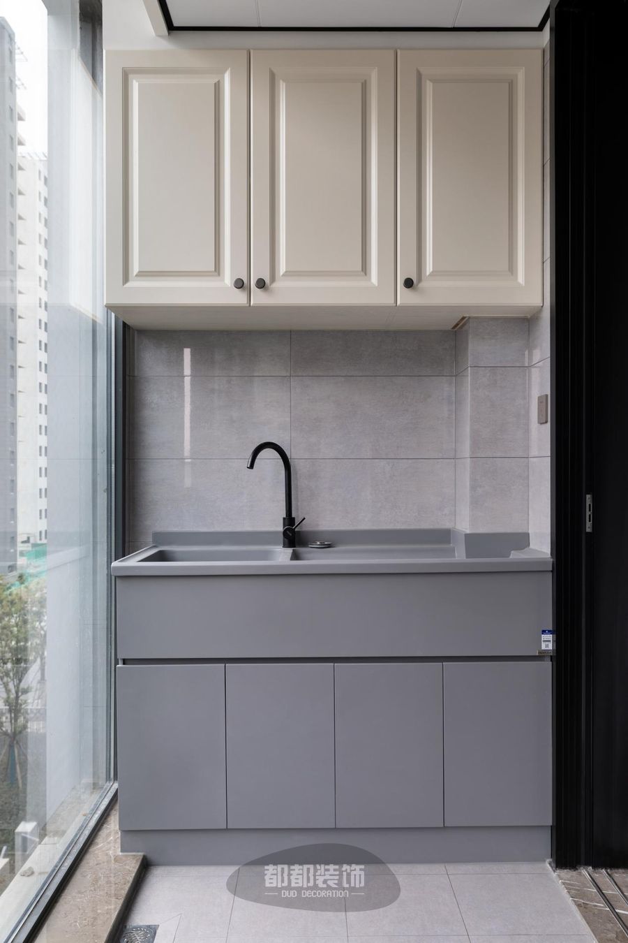 阳台为洗衣机柜+洗衣池+吊柜的组合,收纳本领强大,洗衣机+烘干机双层叠放能更好节省阳台空间,洗手盆也非常必要,业主喜欢种植花草,这里不仅能接水,打理完花草后也可以在这里方便地洗手。
