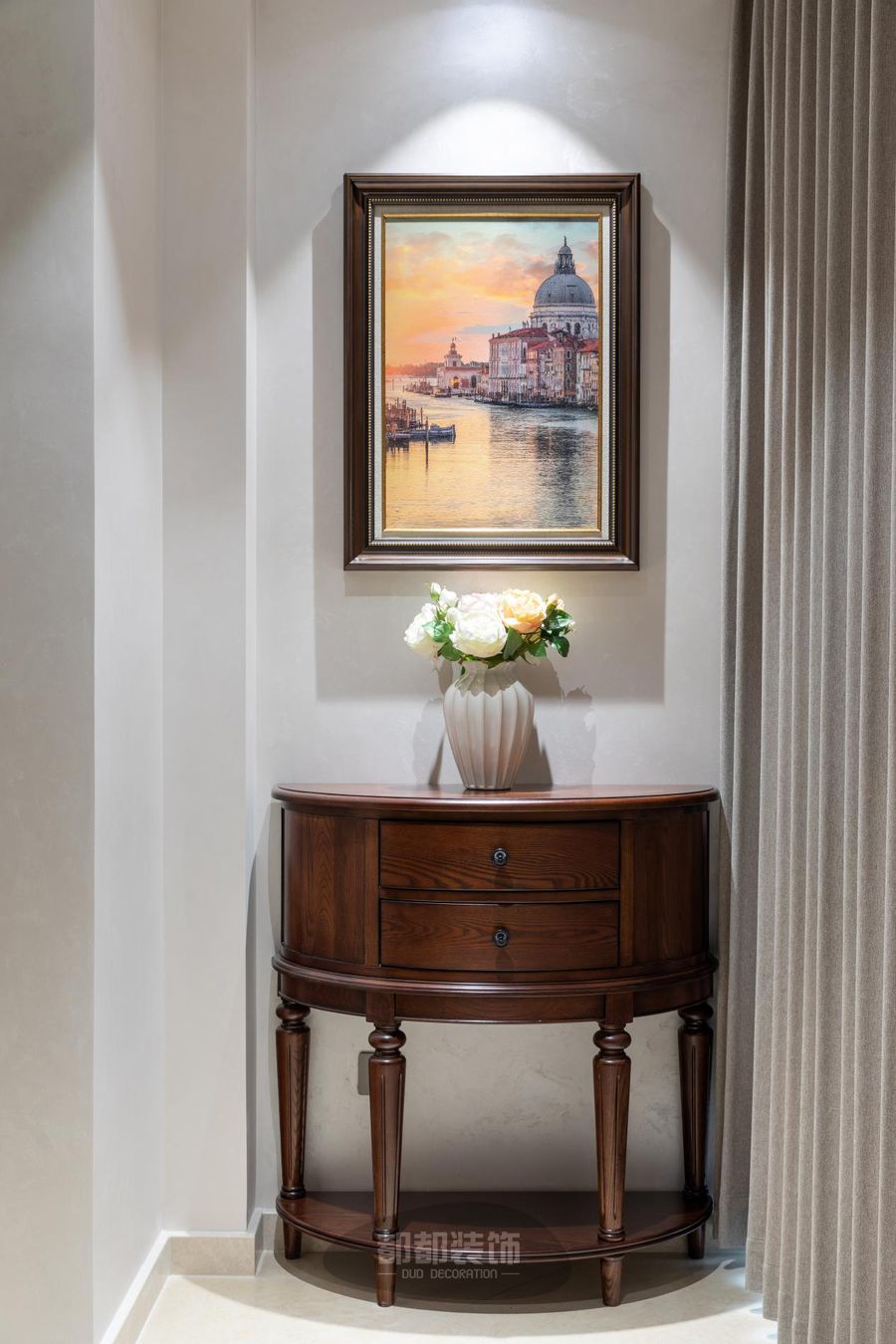 走廊处半圆形置物桌,复古配色与装饰画相框交相呼应,氛围感升级,清新的盆栽加以点缀,为客厅注入一抹恰到好处的温柔。