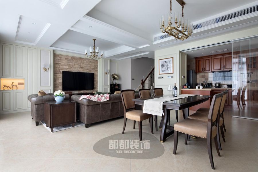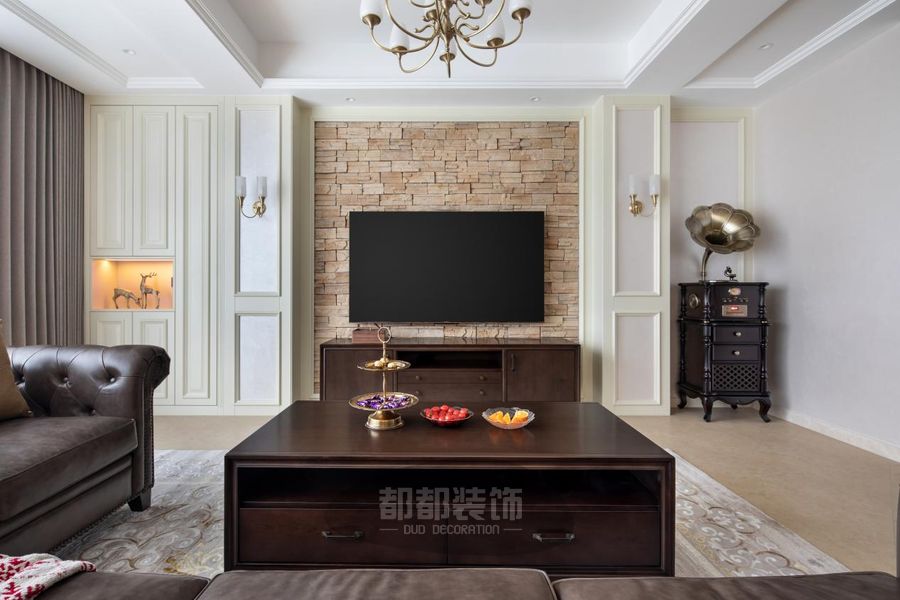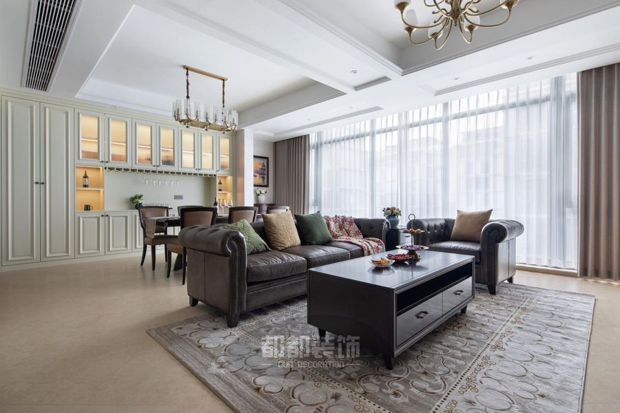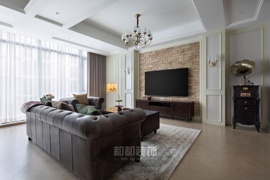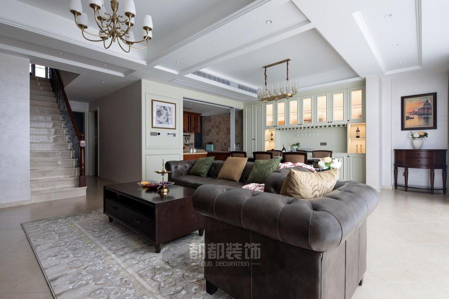美式最吸引人的就是它热烈而温暖的色彩搭配,复古的深棕色皮质沙发和茶几,带着老物件的温润感,色泽油亮、入手细腻,浅灰色的地毯与素色大理石地板刚好与这浓烈的色彩相配,使整个空间既不会压抑也不会轻飘。