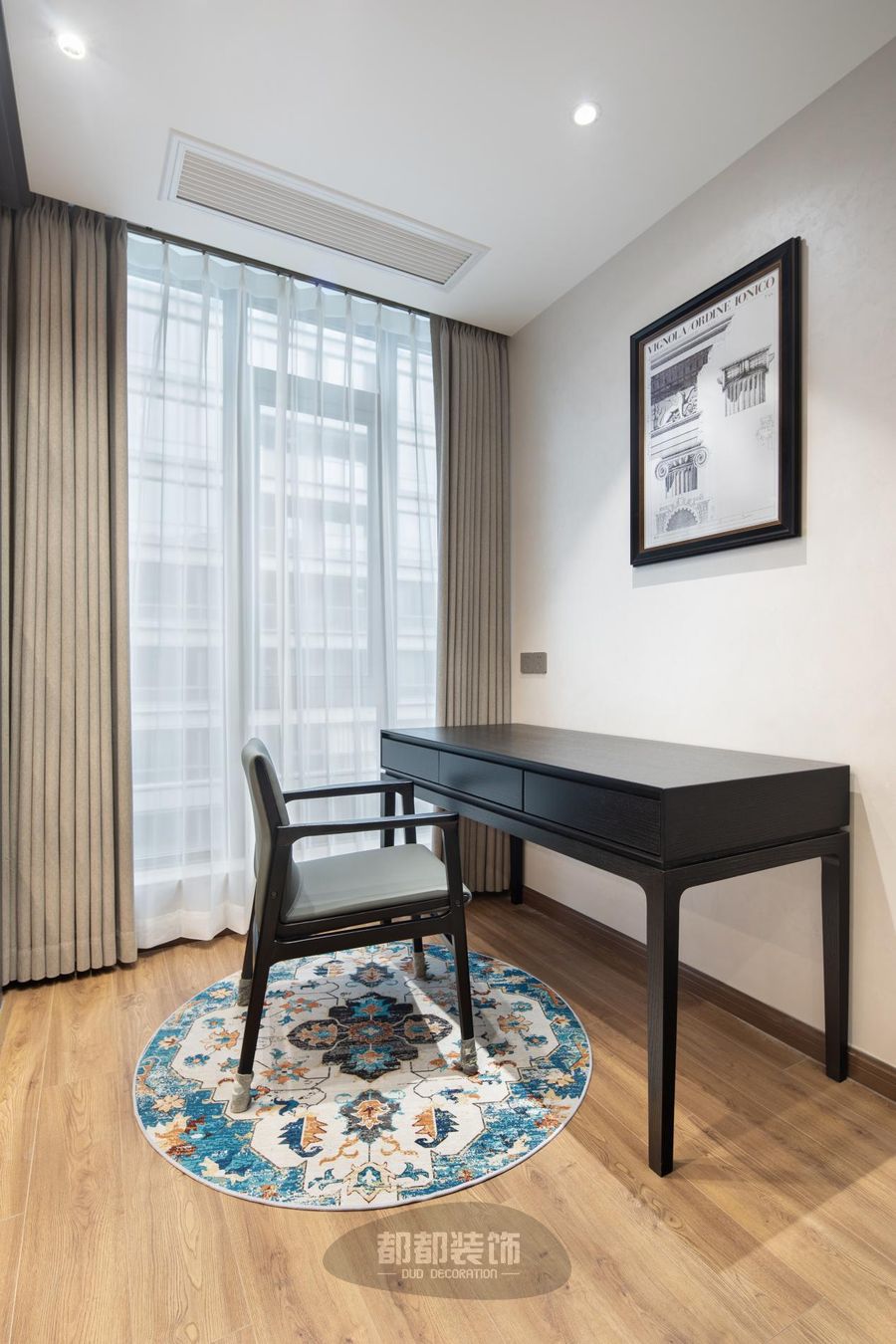 进入书房,跃入眼帘的是一套极简中式桌椅,烟熏橡木的配色,简单的线面搭配,展现出现代意味的的几何魅力。暖黄色木地板上装饰着美式圆形民俗风地毯,花纹美观、线条清晰,给家带来一种别样的异域风情。