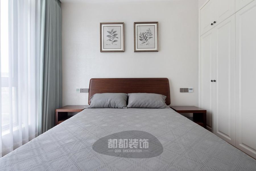 两间次卧设计相近,背景墙简单朴素,分别用草木和建筑装饰画点缀,原木床体配合着木地板,给人以清爽自然之感。整面墙的落地窗设计,朝阳的方向让空间更加明亮,双层窗帘的选用在满足隐私性的同时还具有超强的遮光性。