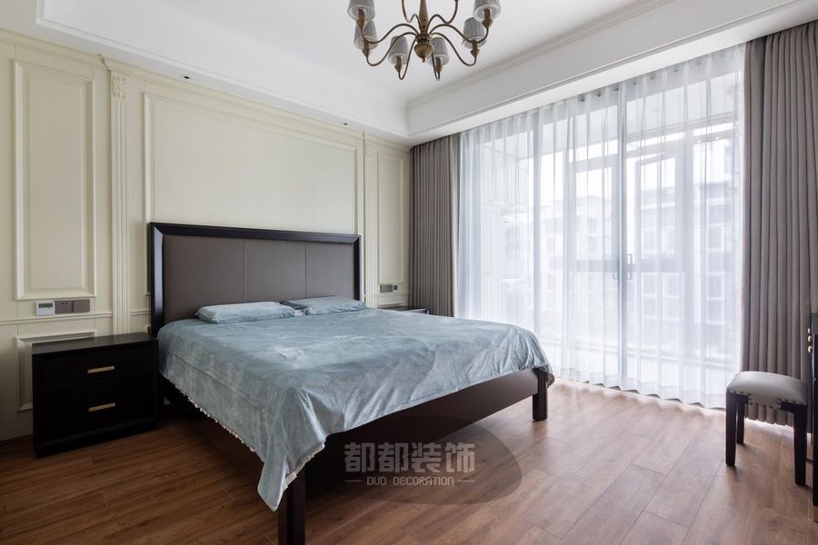 主卧整体在净色的硬装上使用浅雾霾蓝作为跳色,让原本安静的空间变得富有生气。区别于以往的美式案例,本案融入了很多的轻奢元素,有更多的精致感。