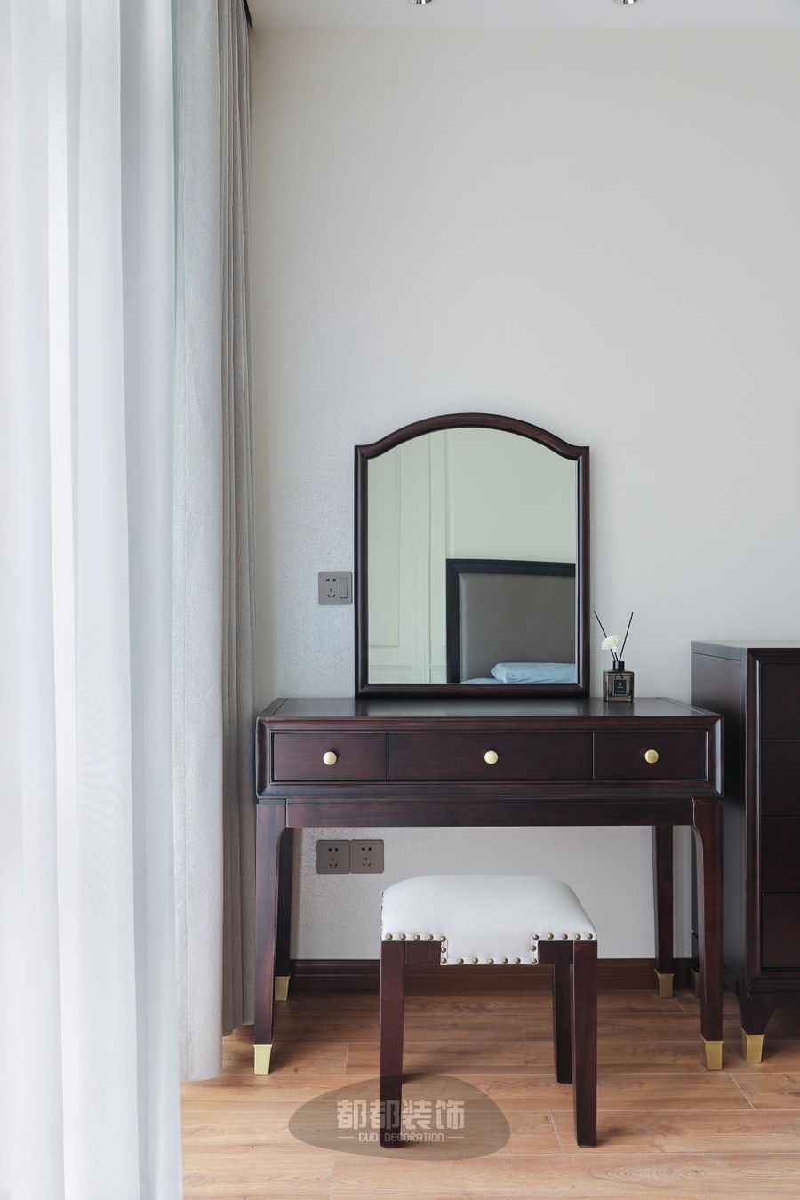 主卧的梳妆台在色调上与床体相协调,白色皮质软包与木质椅脚相互碰撞,一柔一刚,艺术情调呼之欲出。