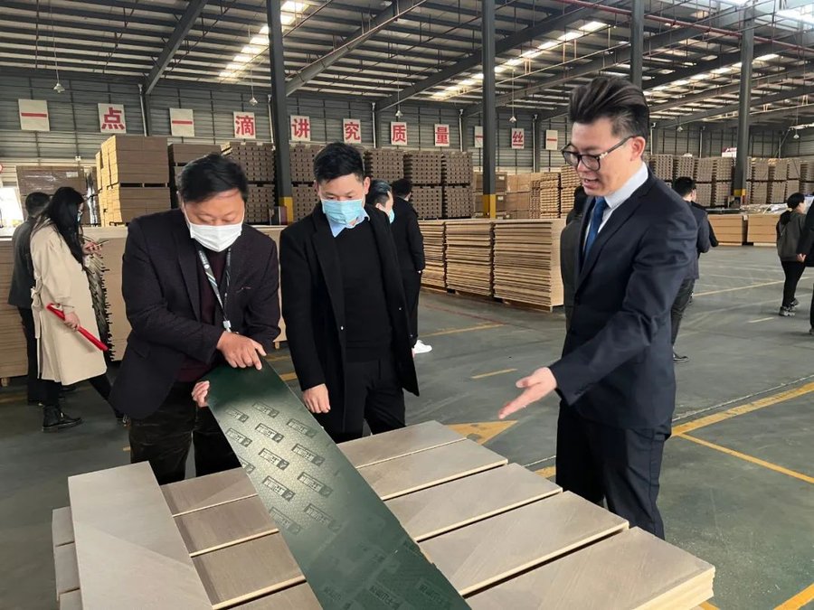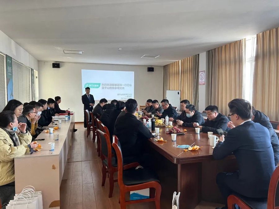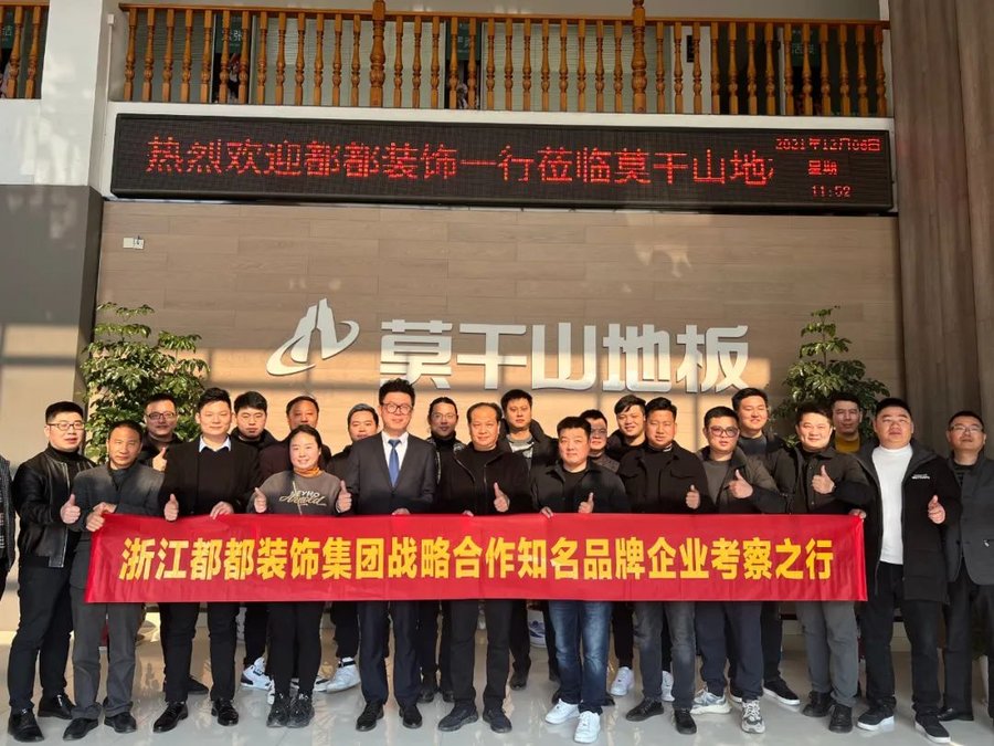 都都装饰与莫干山板材已建立战略合作关系,为了更深入对材料的生产和了解,2021年12月6号,都都装饰董事长都宜贵先生与都都各店店总、管理层赴浙江云峰莫干山地板有限公司参观交流。莫干山地板副总经理房淼、生产总监李禹贤、浙江省区经理章建康热情接待,双方就深度合作进行交流探讨,为未来的共赢合作奠定良好基础。