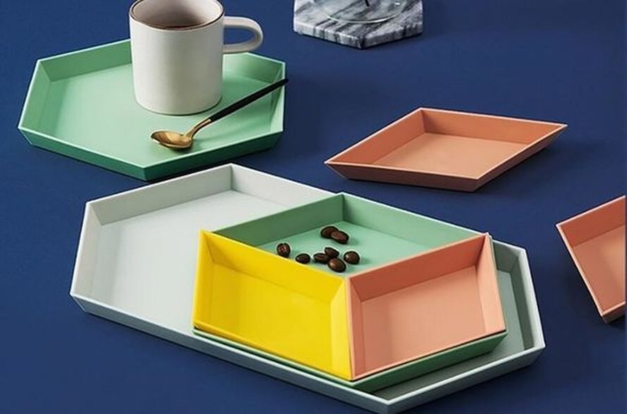 这是一款多种颜色组合的托盘,色彩都是非常靓丽的,看起来简约时尚,放在家里的桌面上盛放小零食,能够为客厅增色不少。几何的造型,每个托盘都棱角分明,可以随意组合起来,就像拼图游戏一样,能够展示更多的可能性,也能成为孩子的摆弄的对象。