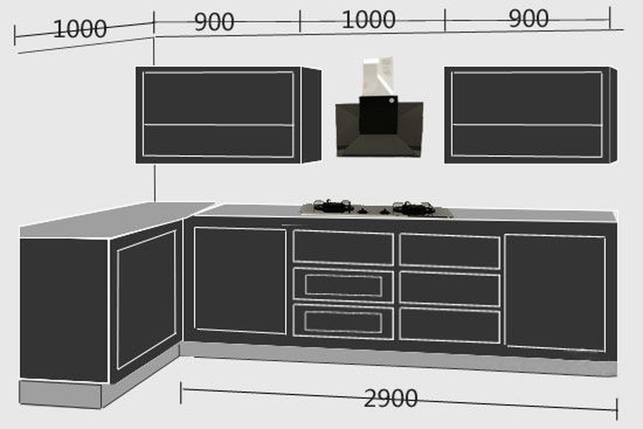 橱柜计量方式:橱柜行业惯用1延米=1米,部分橱柜的计算方式也有1延米=3米或者1延米=2米的,地柜和吊柜都可以用延米计算。如图中吊柜长度=900mm+900mm=1800mm(1.8米/1.8延米),地柜长度=1000mm+2900mm-550mm=3350mm(3.35米/3.35延米),台面与地柜长度相同。一般来说,地柜和台面转角位置,因为重叠,在计算的时候一般减去550mm。所以消费者挑选橱柜的时候必须要问清1延米的计量单位。