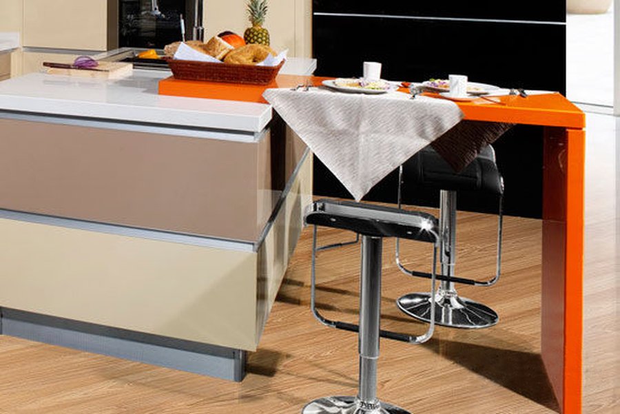 伸缩餐桌:伸缩餐桌折起来的时候是橱柜一部分,拉开则是小型餐桌,这种橱柜适合小户型和蜗居,如果家居空间足够的话,多放一张餐桌和椅子的位置也是有的。
