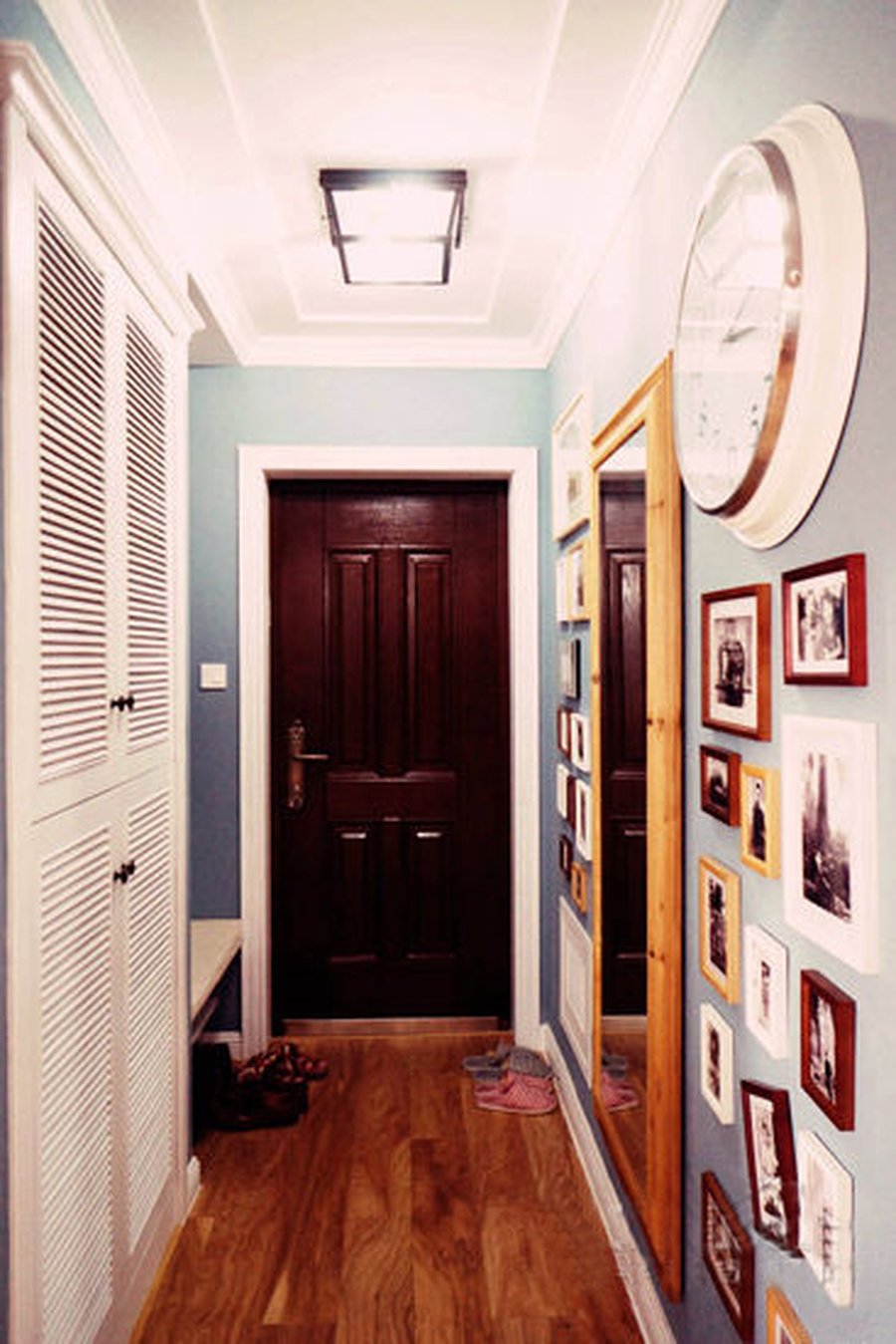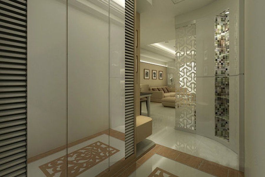 细窄走道型的玄关设置有时候容易从进门的第一印象其就让人觉得空间狭小,其实这种空间感完全可以利用镜面和光源的“魔法”来解决,玻璃、镜面、珠帘等通透性质的材料一方面能够解决室内的采光问题,同时也避免了玄关墙面的单调,增加了室内的艺术性和美感。