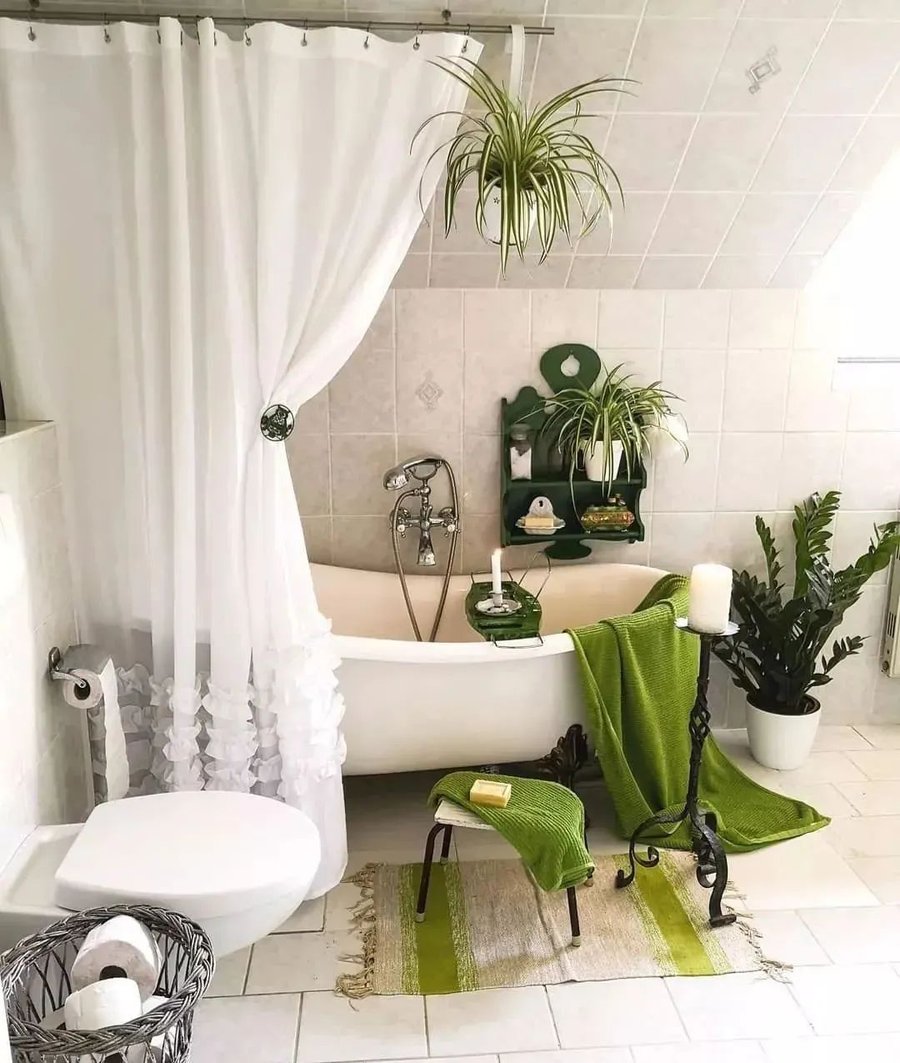 卫浴间不应该成为被绿色遗忘的角落。装修时可以选择些耐阴、喜湿的盆栽放置在卫生间里,使这里多一些生机。