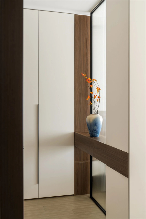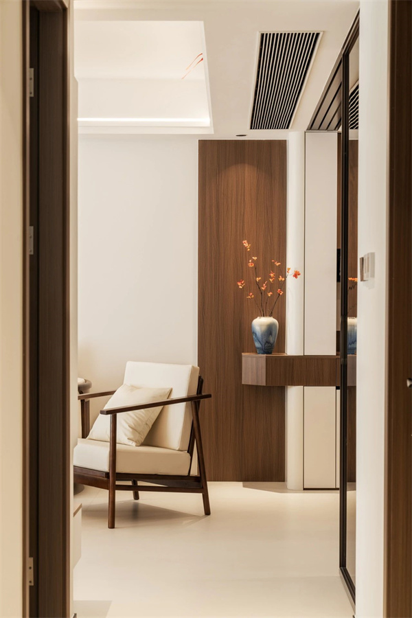 墙面大面积留白给可以只只用一方枯山水盆景点睛;储物柜采用嵌入式设计,外露部分点缀手工锻造的黄铜拉手。