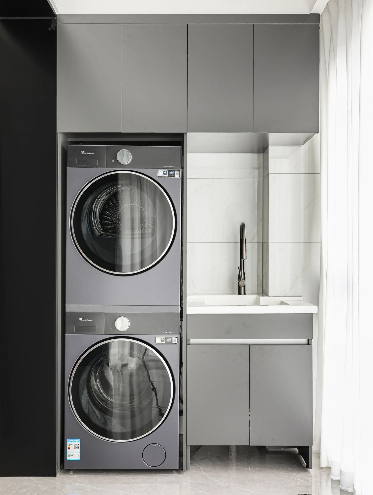 滚筒洗衣机可以直接嵌入定制柜,叠放烘干机之后,还能留下多余的空间放置洗衣机耗材,直接坐到空间利用率最大化。