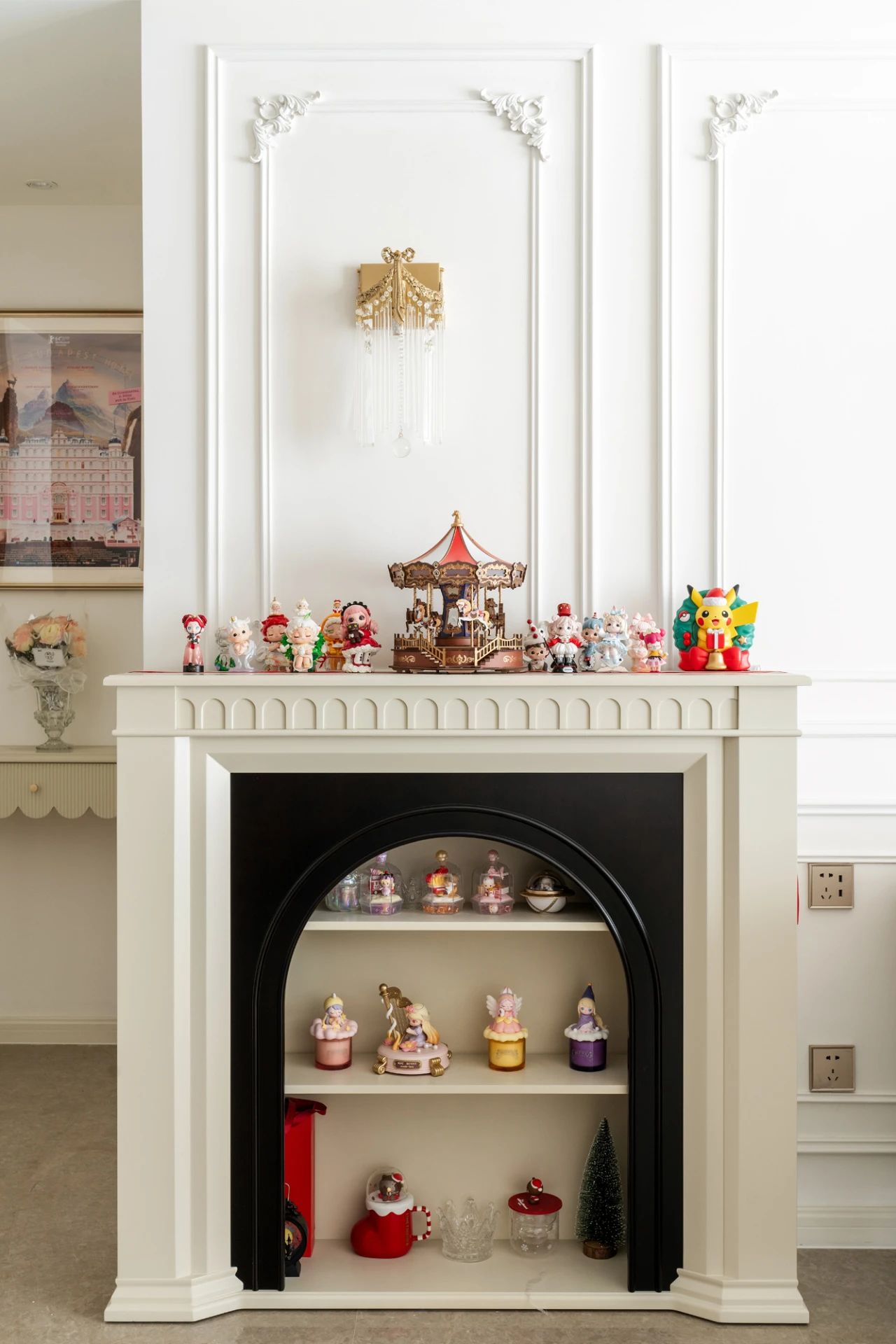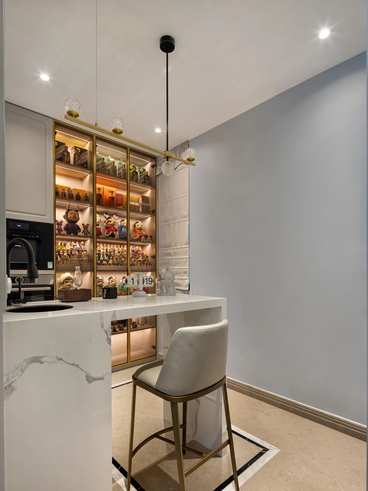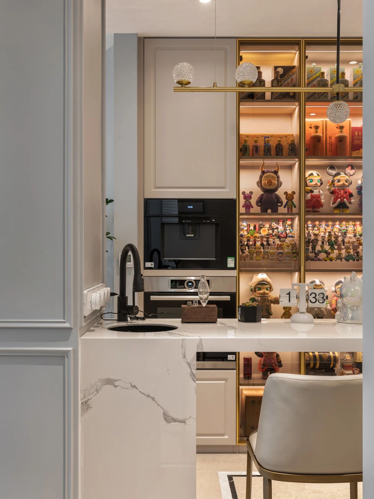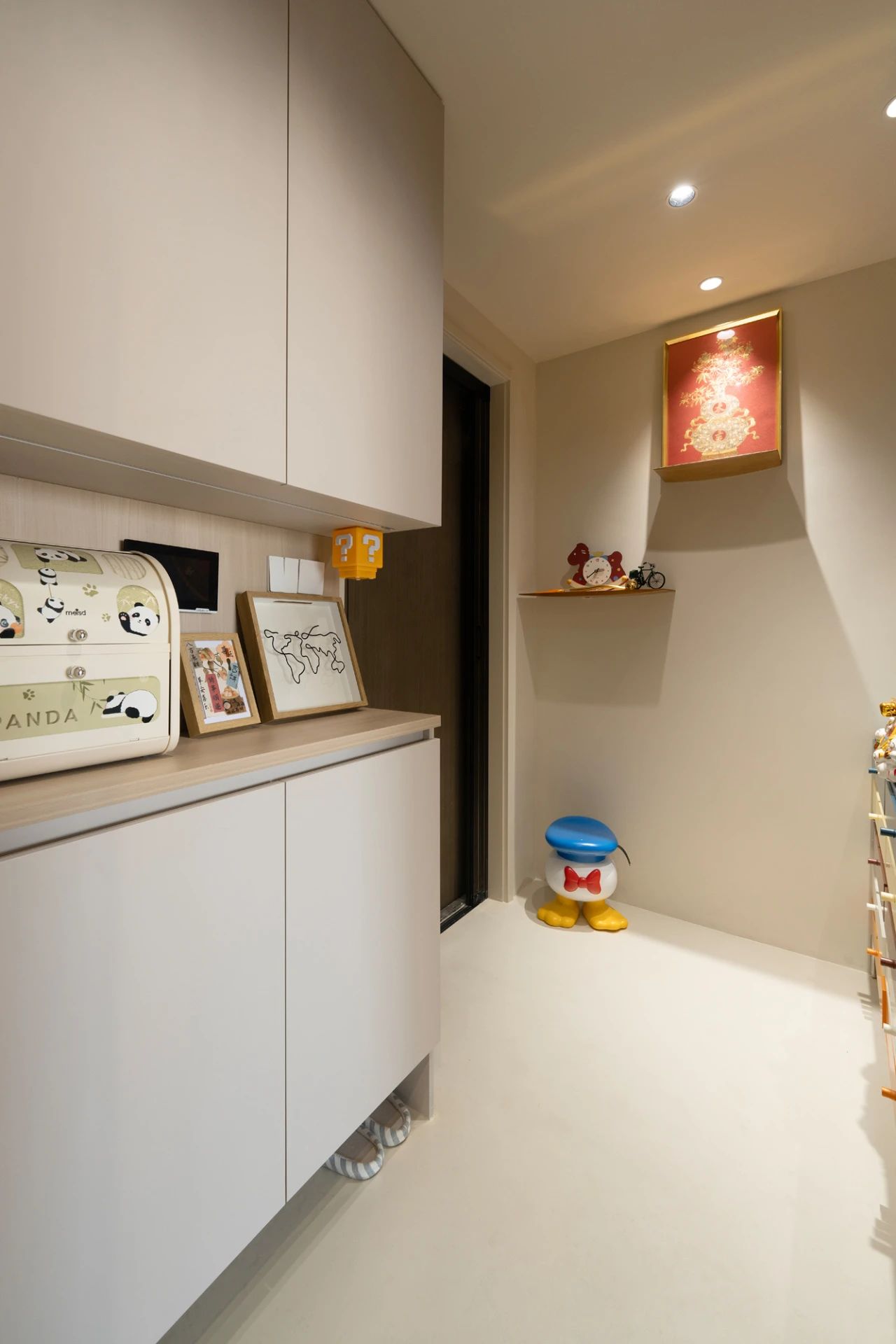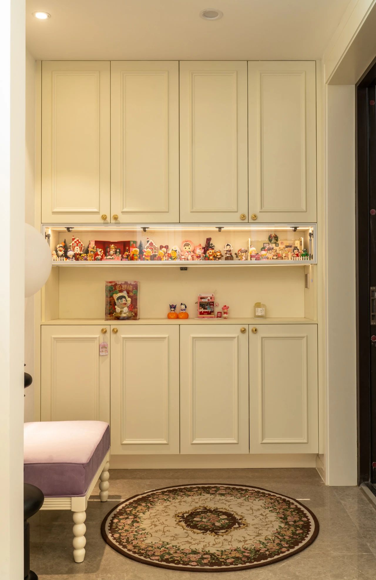 比如下面这个案例中,设计师根据业主的需求在定制玄关柜时,加了一道置物板,用于展示主人喜欢的盲盒产品。