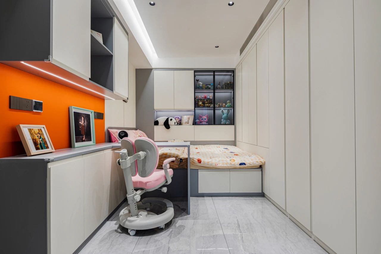 那么我们在案例中也能看到,很多业主也会选用一整面墙来打造一个专门的“娃区”。