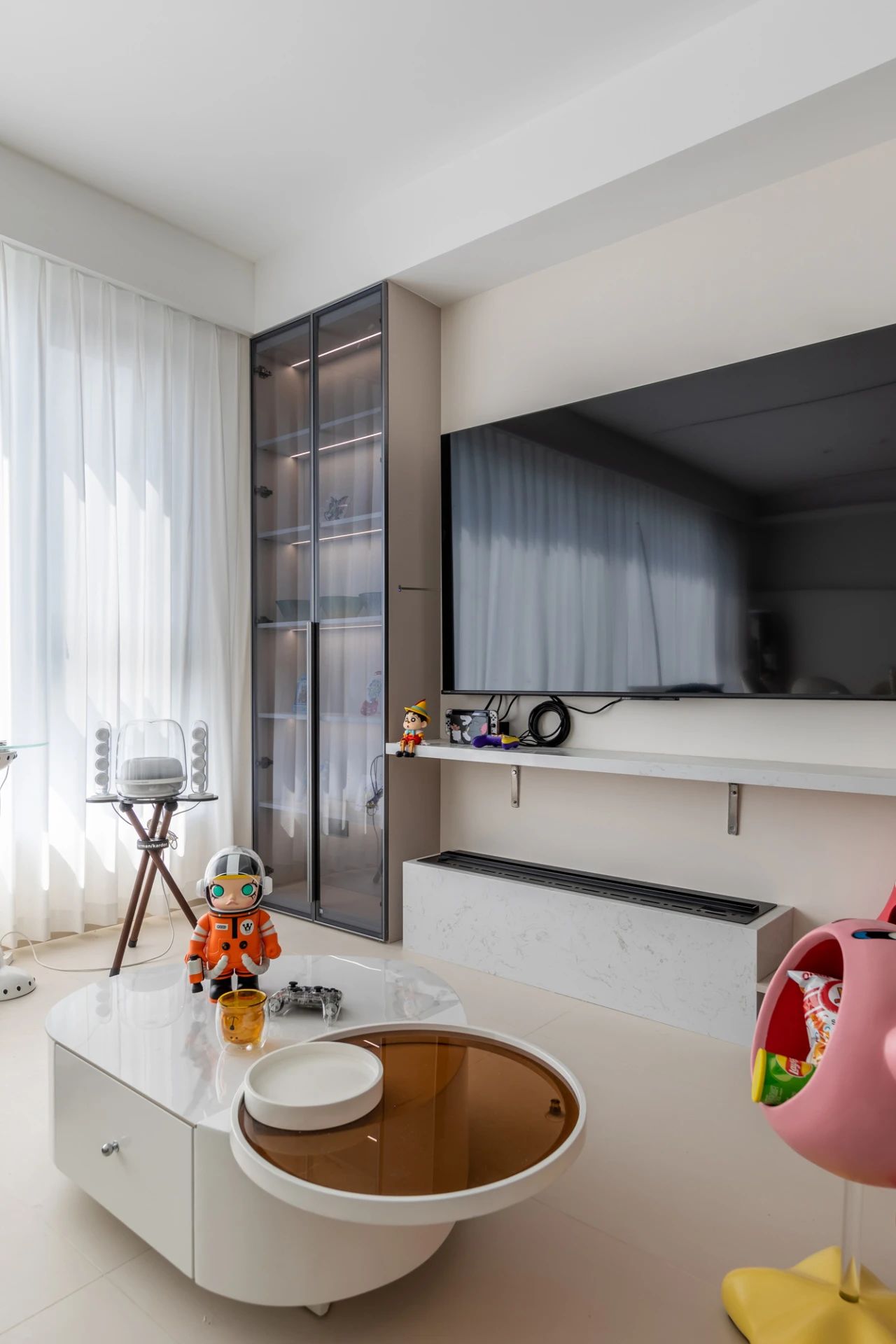 定制柜可以根据玩具的长度和高度规划内部空间,柜门选择高透玻璃柜门,如果觉得透明玻璃太单调,也可以选择茶色或黑色玻璃,更显高档。