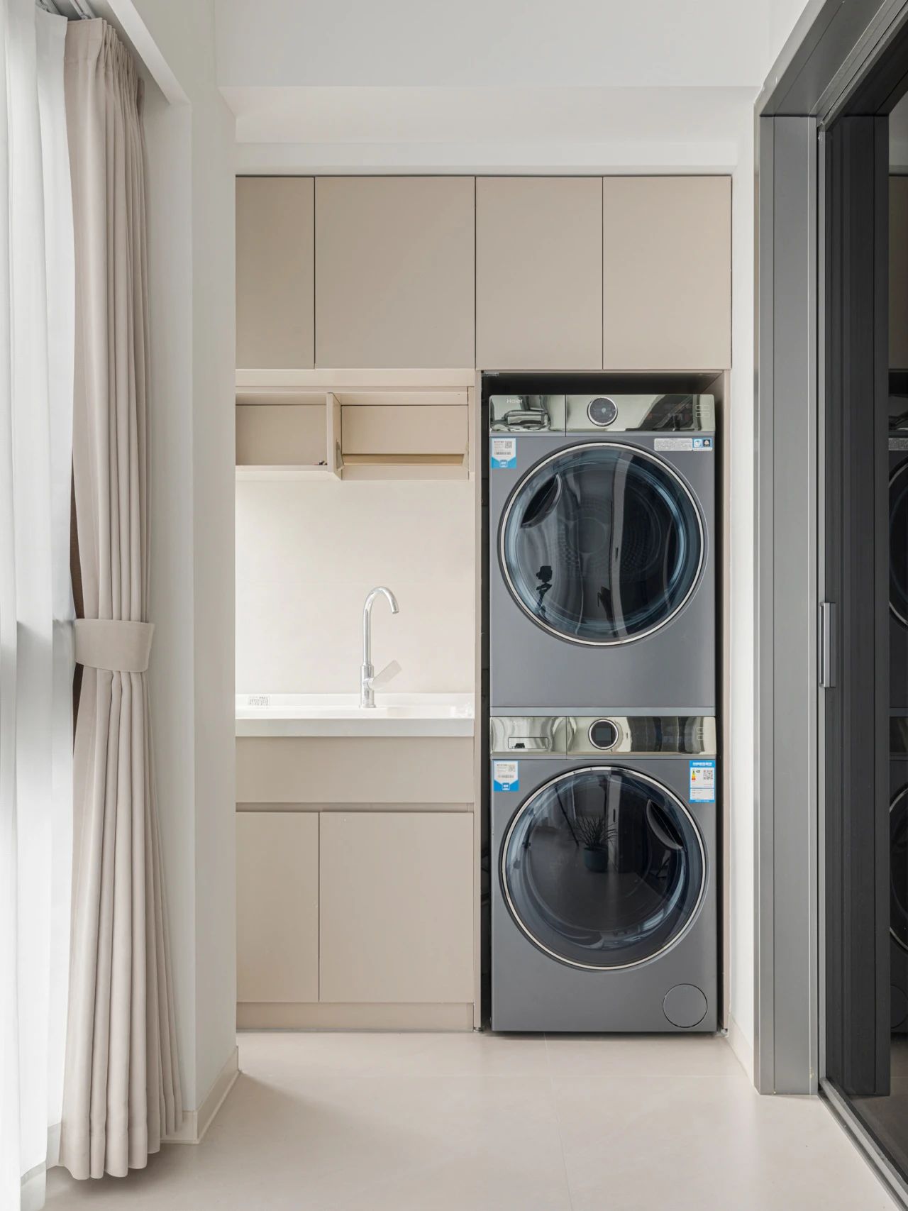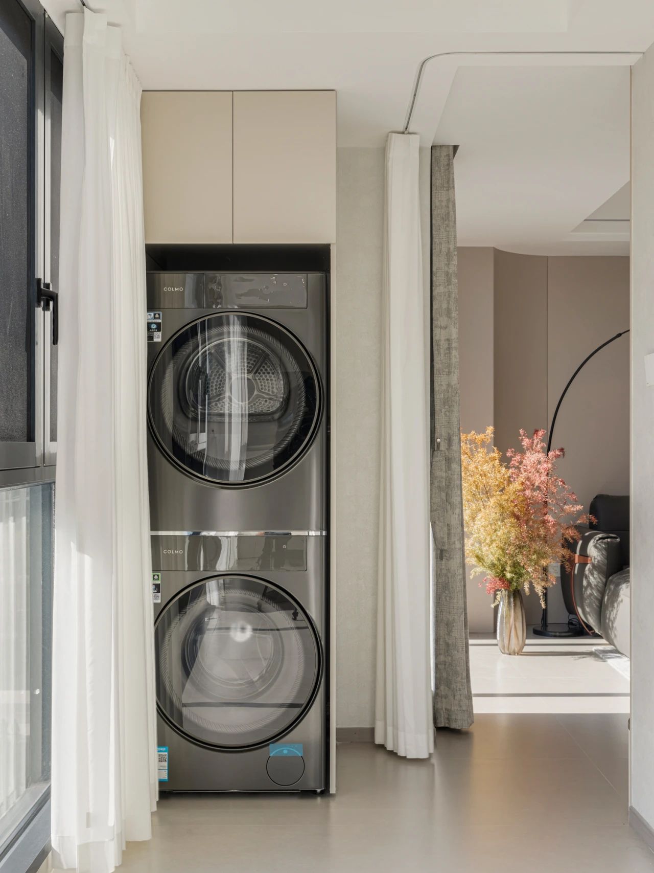 滚筒洗衣机可以直接嵌入定制柜,叠放烘干机之后,还能留下多余的空间放置洗衣机耗材,直接坐到空间利用率最大化。