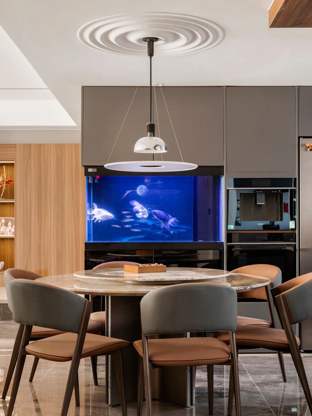 鱼缸嵌入定制柜 可养宠可观景 养鱼或养龟的家庭,可以考虑将鱼缸嵌入定制柜一角。 根据鱼缸尺寸提前预留柜体位置,将水体与造景融入整面墙的收纳系统中,不仅节省空间,更让这一角成为家中天然的视觉焦点。